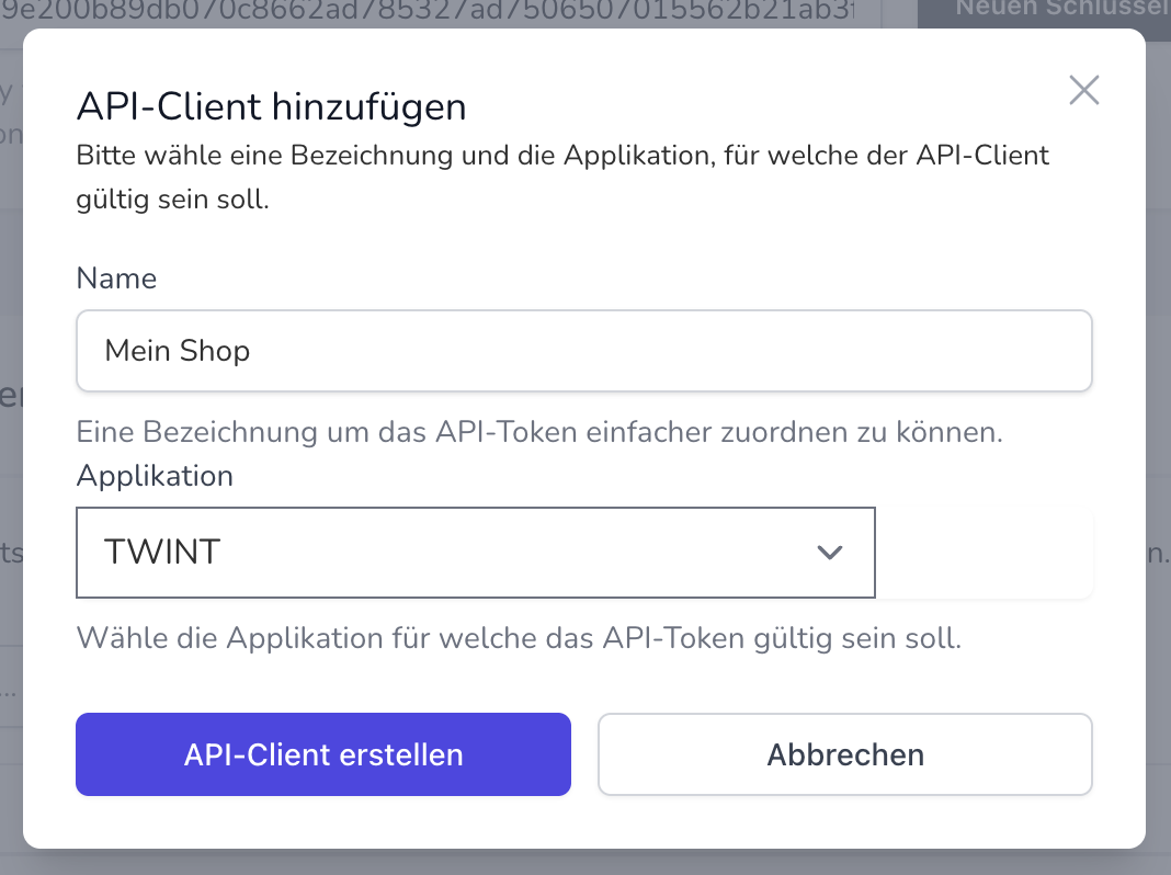 Auf derselben Seite unter „Api-Clients > Api-Client hinzufügen“ kannst du einen neuen API-Client mit Client ID und Client Secret generieren. Gib einen beliebigen Namen ein (z.B. den Namen deines Shops) und wähle im Auswahlfeld „TWINT“.