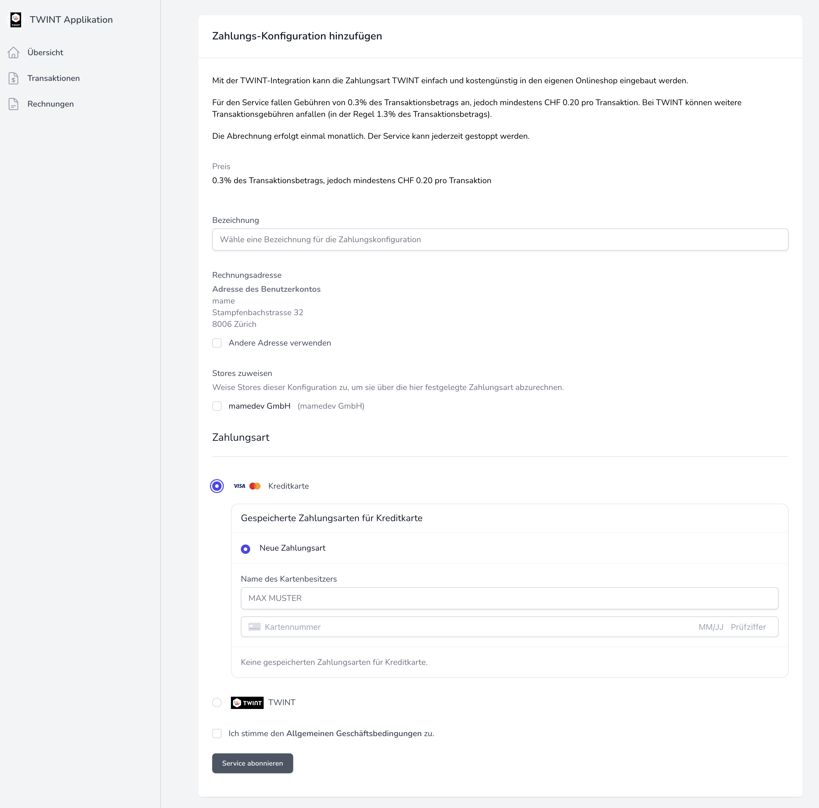 Für die Abrechnung der Transaktionsgebühren muss im Konto bei mamedev.ch eine Zahlungskonfiguration hinzugefügt werden.