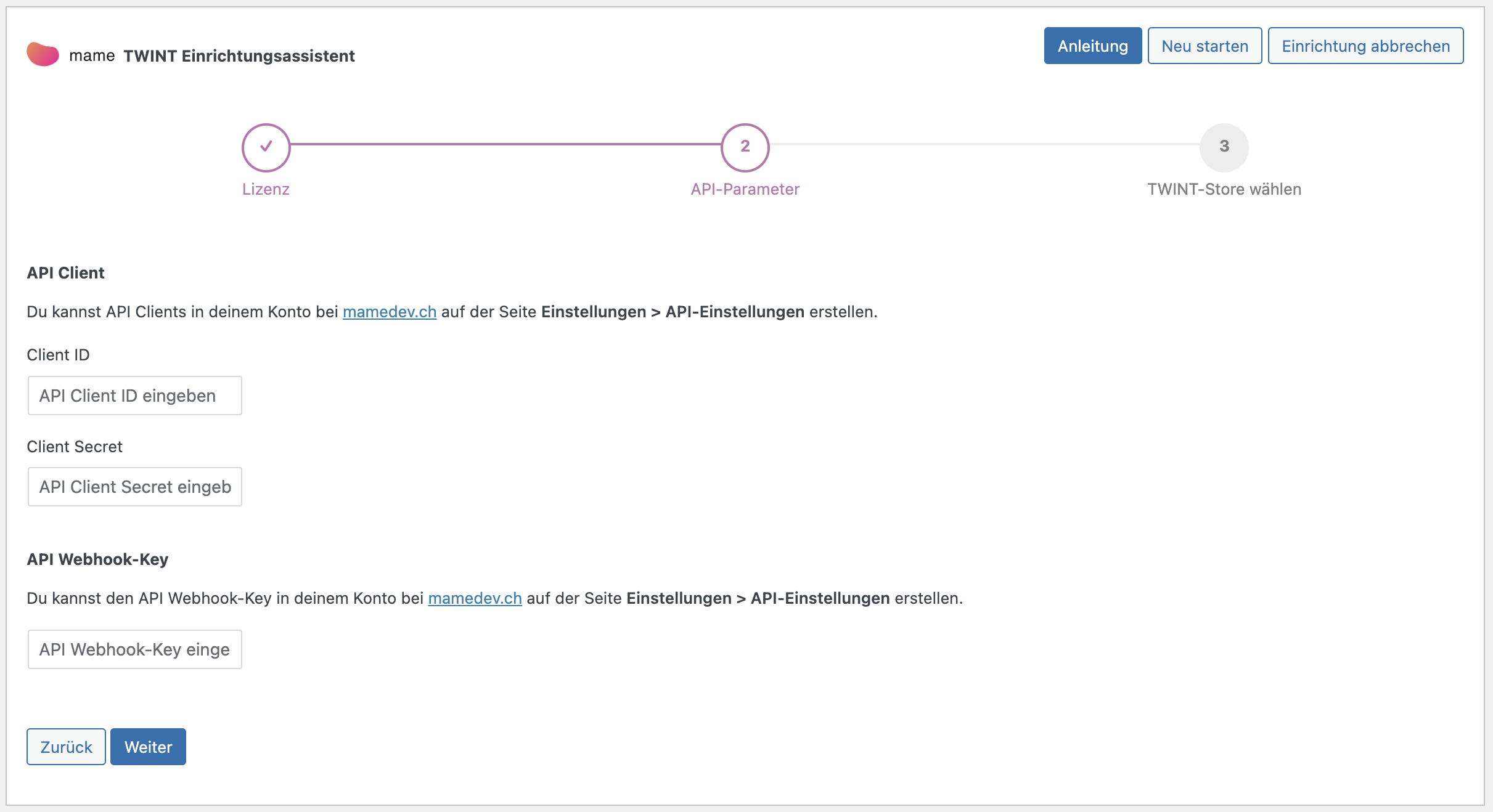 Trage nun Client ID, Client Secret und Webhook-Key in die entsprechenden Felder im Einrichtungsassistenten ein.