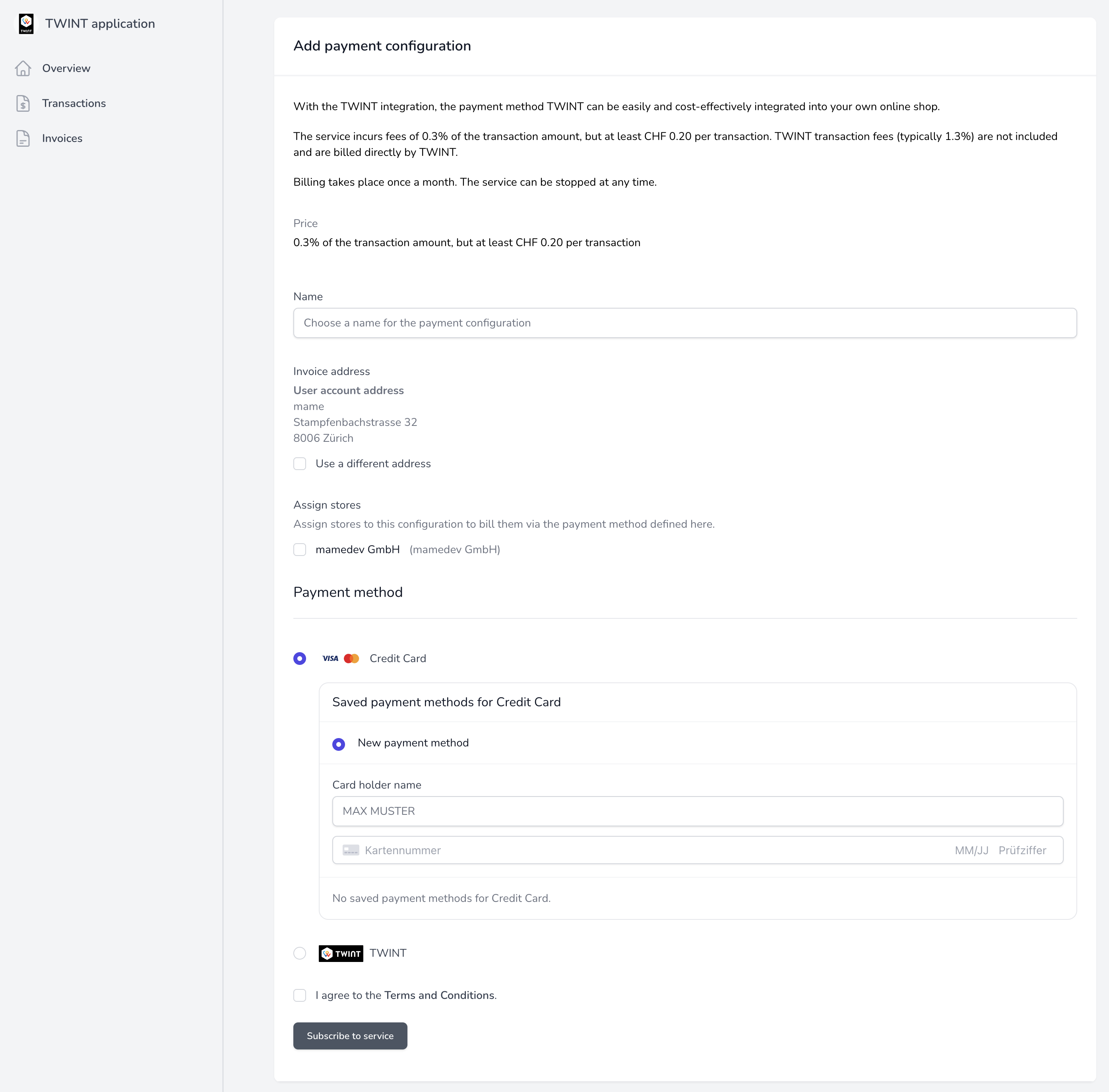 In this step, a store must be added to the TWINT portal and linked to the mamedev.app account.